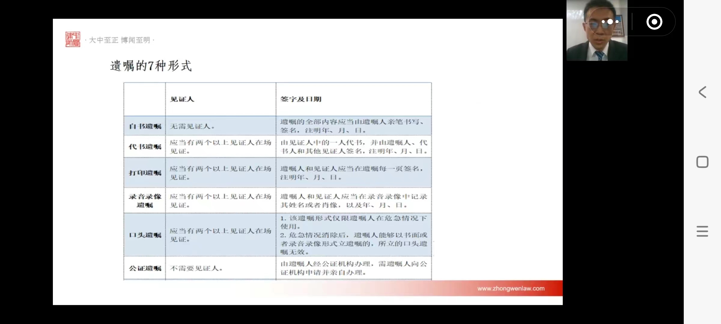 單賓介紹了《民法典》關(guān)于遺囑形式相關(guān)規(guī)定的變化,在自書遺囑,代書遺囑,打印遺囑,錄音錄像、口頭遺囑、公證遺囑等方面,通過典型案例,為老同志們重點解讀了“遺囑的性質(zhì)與效力”“遺囑的形式要件”“遺囑繼承”等與大家切身利益息息相關(guān)的法律知識。講座過程中,老同志們結(jié)合自身的實際問題進(jìn)行了在線咨詢,單律師根據(jù)《民法典》的相關(guān)規(guī)定對大家普遍關(guān)心的問題作了耐心詳細(xì)的解答。