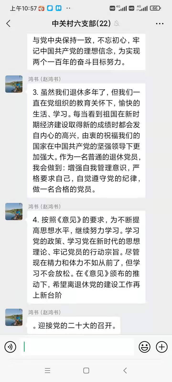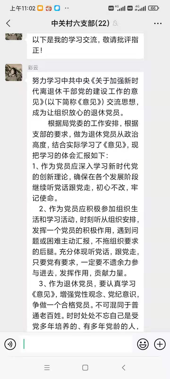 根據(jù)局黨委部署,結(jié)合疫情防控要求,院機關(guān)離退休干部中關(guān)村第六黨支部(以下簡稱中關(guān)村六支部)圍繞學習《關(guān)于加強新時代離退休干部黨的建設(shè)工作的意見》(以下簡稱《意見》),于7月25-27日通過支部微信群召開支部大會。