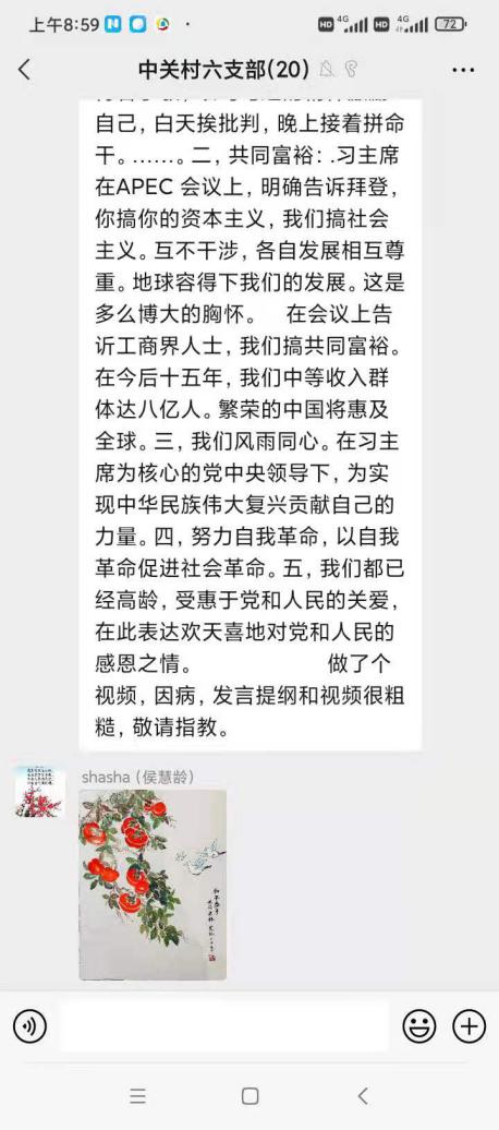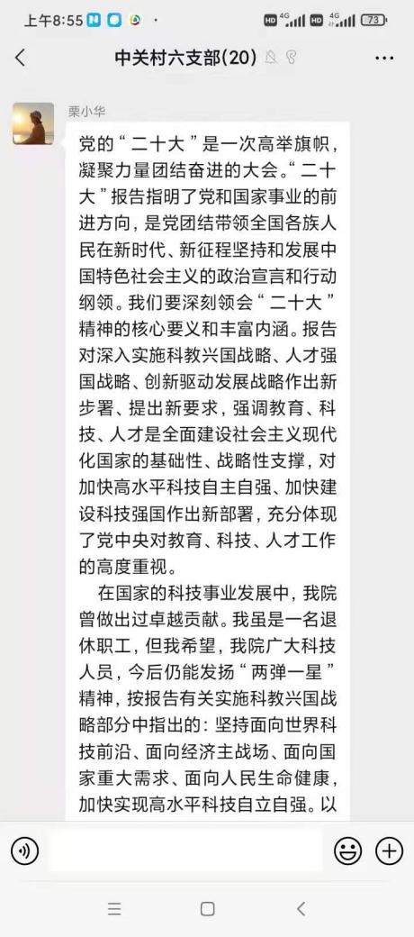根據(jù)局黨委部署,結(jié)合疫情防控要求,院機(jī)關(guān)離退休干部中關(guān)村第六黨支部(以下簡稱中關(guān)村六支部)在前期安排自學(xué)的基礎(chǔ)上,于2022年12月22日通過微信群召開支部大會,交流學(xué)習(xí)黨的二十大精神心得體會。支部書記栗小華同志主持會議。