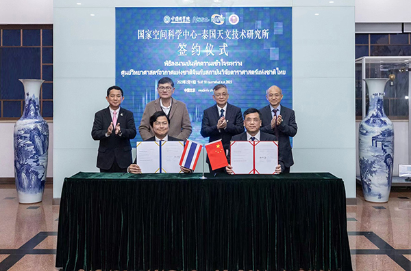 會(huì)見(jiàn)結(jié)束后,侯建國(guó)、阿內(nèi)、張亞平、詩(shī)立叻共同見(jiàn)證了中國(guó)科學(xué)院國(guó)家空間科學(xué)中心與泰國(guó)天文技術(shù)研究所合作協(xié)議簽署。