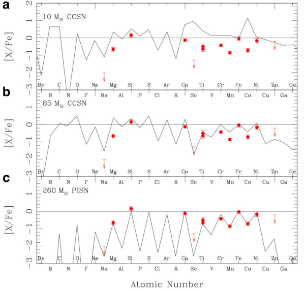 化學(xué)豐度特殊恒星LAMOST J1010+2358與超新星模型的比較。紅色圓點(diǎn)代表LAMOST J1010+2358的元素豐度,黑色實線分別表示前身星質(zhì)量為10倍太陽質(zhì)量的核坍縮超新星(a)、85倍太陽質(zhì)量的核坍縮超新星(b)、260倍太陽質(zhì)量的對不穩(wěn)定超新星(c)。
