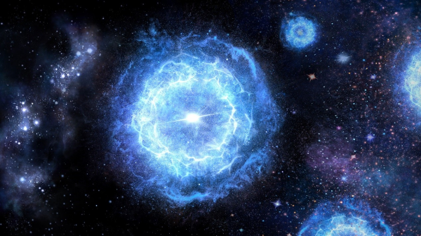 第一代超大質(zhì)量恒星演化成為對不穩(wěn)定超新星的藝術(shù)展示圖。對不穩(wěn)定超新星將富含多種元素的物質(zhì)拋射到星際介質(zhì)中,并以此形成下一代恒星。