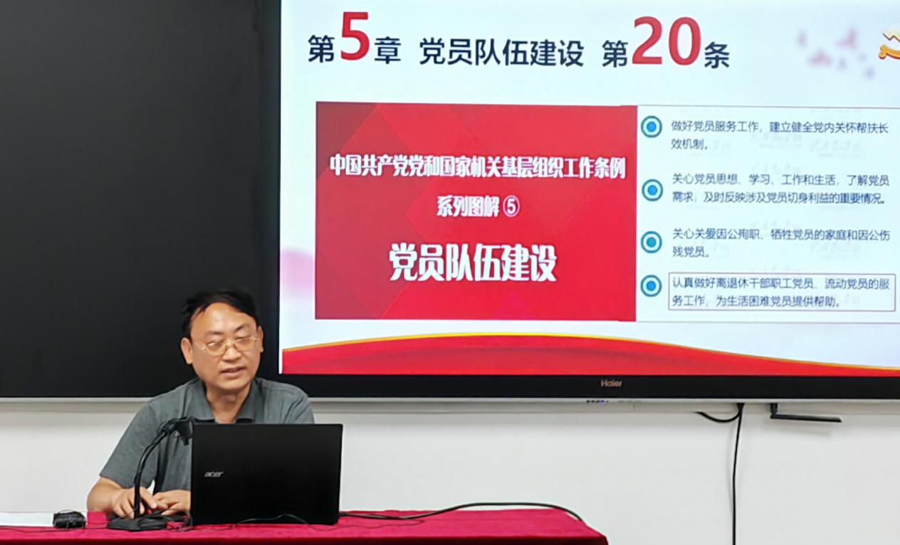 曹以玉同志作了《認真學(xué)習貫徹離退休干部黨建工作要求,扎實做好院機關(guān)離退休干部黨支部工作》輔導(dǎo)報告,介紹了近年來黨內(nèi)法規(guī)中有關(guān)離退休干部黨建工作的規(guī)定要求和機關(guān)離退休干部黨支部情況,重點從強化政治引領(lǐng)、嚴格組織生活、加強日常管理、傳遞關(guān)心關(guān)愛、發(fā)揮優(yōu)勢作用等五個方面講解了如何結(jié)合實際開展好黨支部工作。同時要求,各位骨干要高度重視,提高責任意識,結(jié)合離退休干部黨建工作特點規(guī)律和支部實際,務(wù)實、創(chuàng)新落實好相關(guān)要求,不斷增強黨支部工作的政治性、時代感,更好地促進離退休干部政治、思想和黨組織建設(shè)。