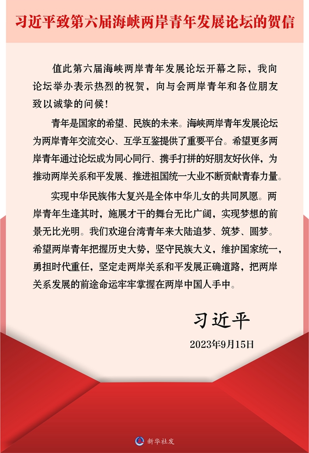 新華社北京9月15日電 中共中央總書記、國家主席習近平15日向第六屆海峽兩岸青年發(fā)展論壇致賀信。