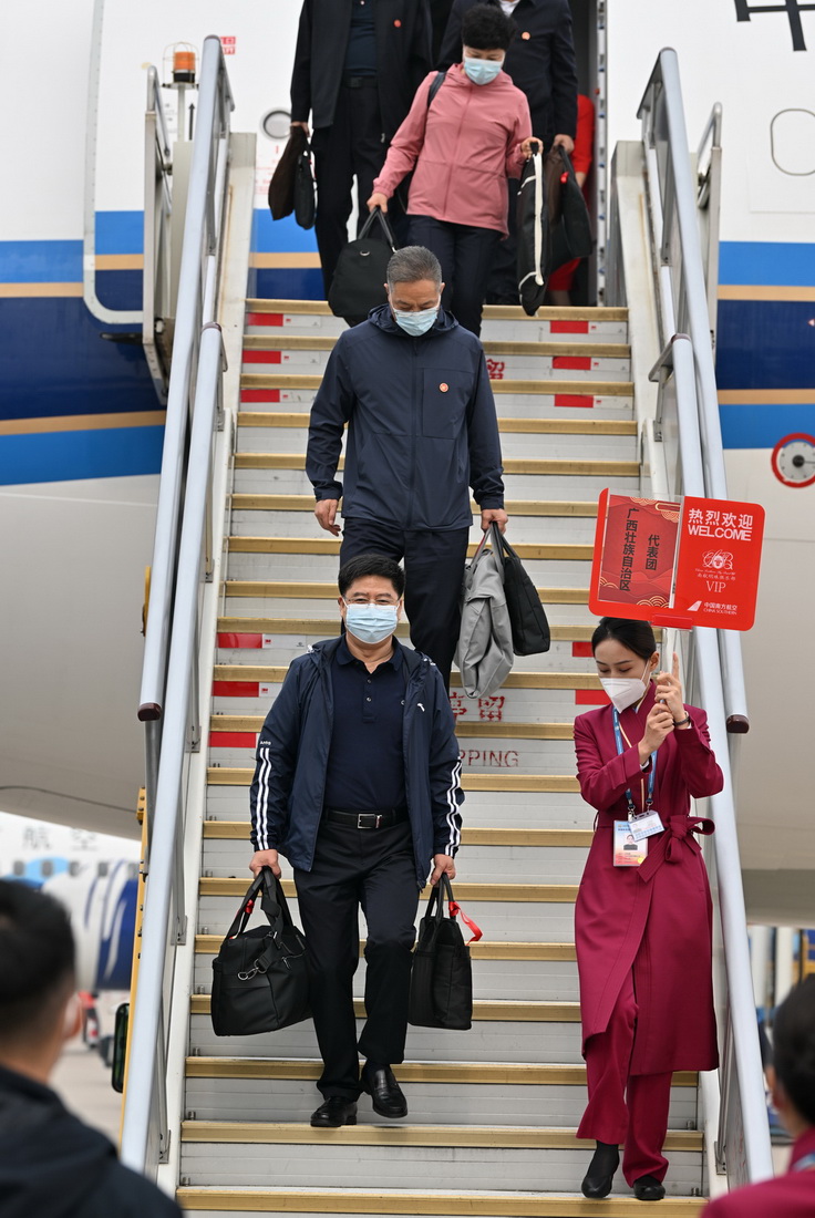 10月13日,來自廣西壯族自治區(qū)的黨的二十大代表乘飛機抵達北京首都國際機場。新華社記者 陳益宸 攝